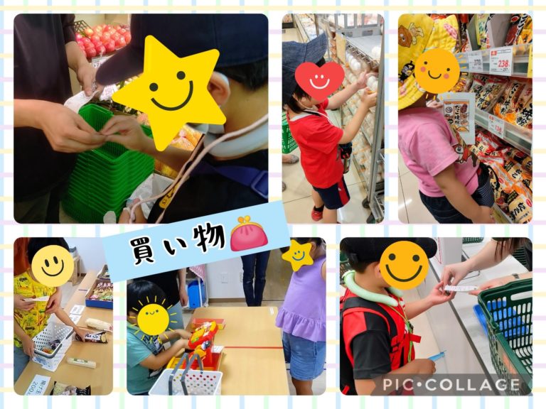 ※ 気温が30℃を超える暑い日が続き、熱中症警戒アラートも出ていたので、後半は、室内での活動(本物のお金を使った買い物ごっこ)に切り替えています