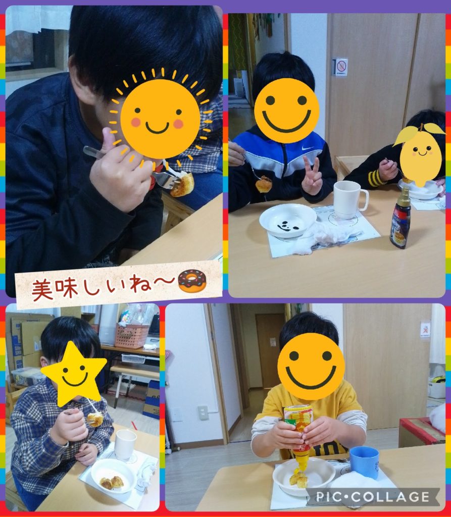 材料を聞いた時には「豆腐でドーナツ?」「お味噌汁のやつ?」「豆腐苦手…」と驚いたり心配したりする声もありましたが、できあがったドーナツを食べると「美味しい!」「もっと食べたい!」と笑顔が広がり、新しい味との出会いを喜ぶ様子が印象的でした✨